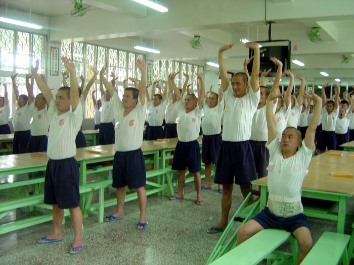 台湾将法轮功纳入监狱的教化课程中两岸监狱的强烈对比,图为受刑人炼五套功法.
