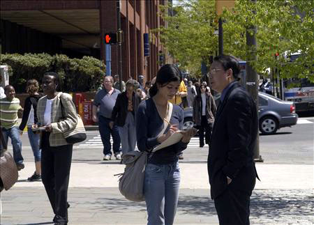 费城学员在自由钟广场抗议中共活体摘取法轮功学员器官的暴行 图为天普大学网站记者采访