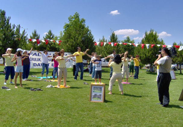 土耳其的新老学员在安卡拉的公园里一起洪法,炼功图为STAR电视台的记者的采访2006-6-24至25