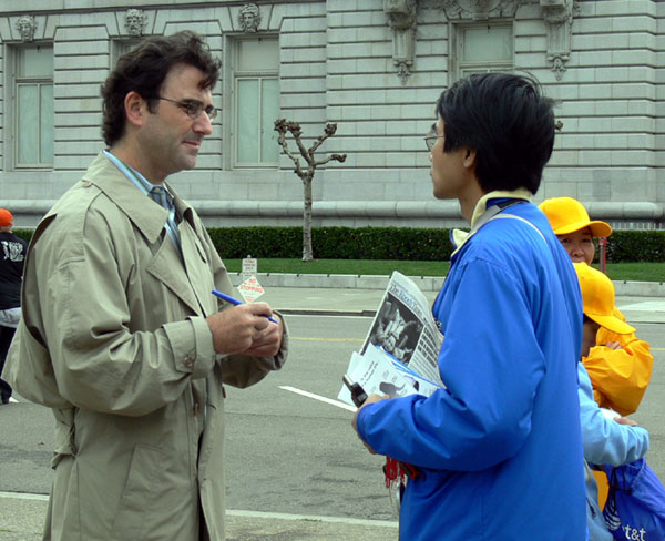 法轮功学员参加旧金山老兵节盛大游行 图为学员接受旧金山纪事报记者采访 2006-11-11