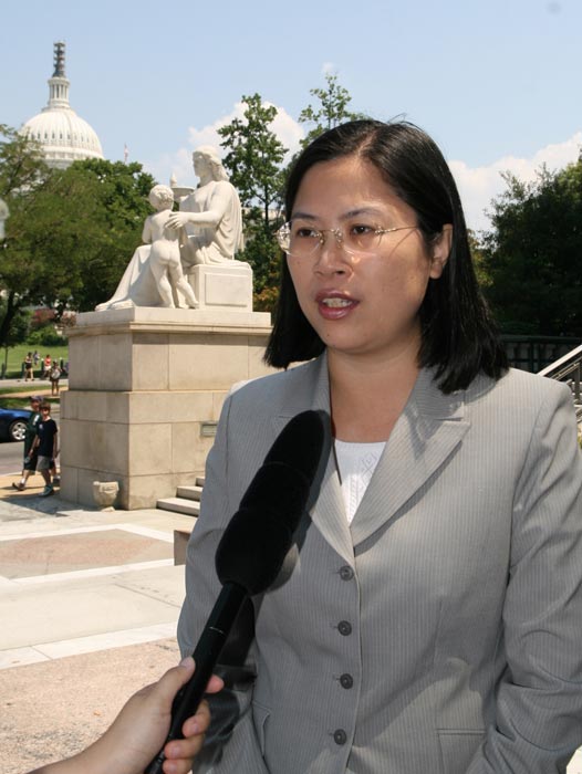 费城学员在自由钟广场举办新闻发布会抗议中共活体摘取法轮功学员器官的暴行 图为学员接受媒体采访2006-4-29 美国会圆桌听证香港遣返事件图为人权律师朱婉琪表示法轮功议题两岸三地对比明显2007-8-2