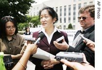 美国联邦法院哥伦比亚地区法庭对王文怡撤销起诉,图为王文怡6月21日在法庭外接受媒体采访.