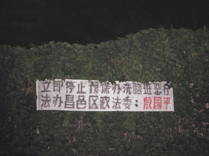 挂在吉林市昌邑区委正门前写有“立即停止预谋办洗脑班、法办昌邑区政法委殷国平”的条幅