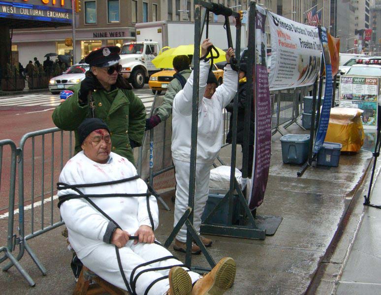 法轮功学员在纽约无线电城(Radio City)前揭露迫害的酷刑模拟演示2006-1-23