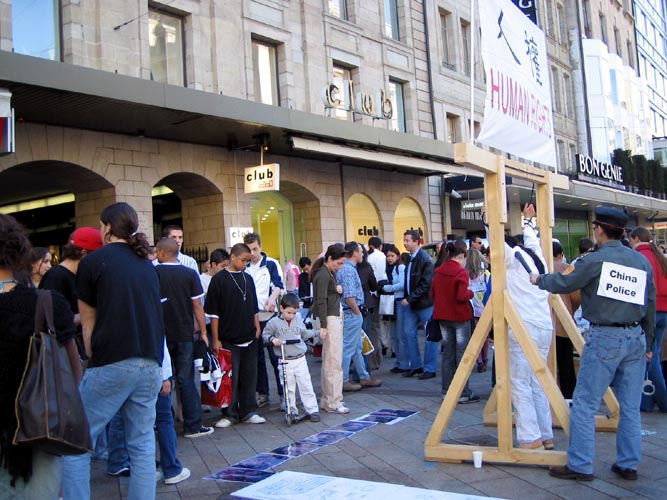 2005年3月,联合国第61届人权会期间法轮功学员每周在日内瓦街头举行反酷刑展,揭露在中国大陆对法轮功学员的残酷迫害