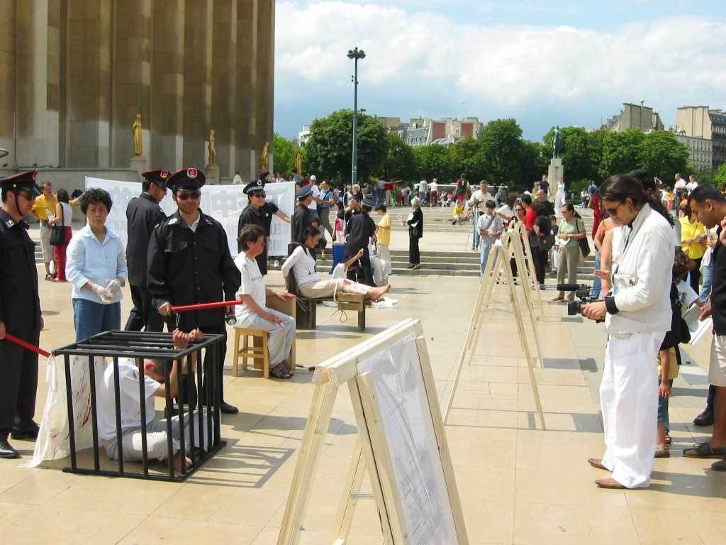 法国法轮功学员在人权广场揭露江氏集团酷刑迫害法轮功学员的罪行 2004-07-17