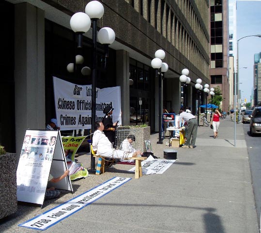 加拿大渥太华法轮功学员办反酷刑展讲真相 图为移民部前的反酷刑展
