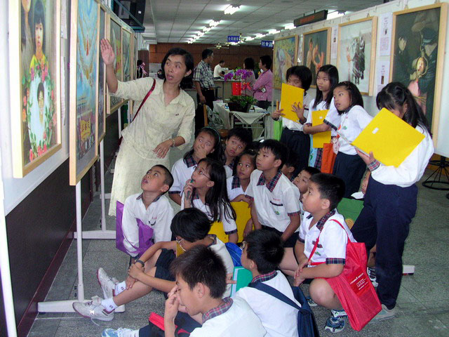 “真善忍国际美展”在台湾花莲县巡回展览 图为用心观画的孩子们
