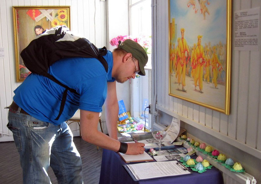 芬兰法轮功学员在首都赫尔辛基举办真善忍国际美术展 图为看完画展的观众签名呼吁制止中共迫害法轮功2006-6