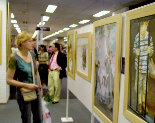 荷兰学员在Delft古城图书馆举办真善忍艺术展。图为民众在观看作品 2006-5-6