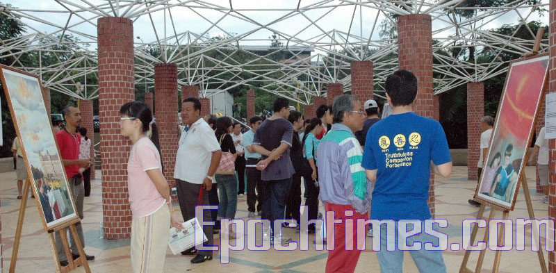 法轮功学员于“七•二零”之际在吉隆坡举办“真善忍画展”图为导览向民众介绍画作并讲真相