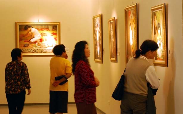 台湾嘉义县举办“真善忍国际美术展览” 图为民众聚精会神的观赏作品 2007-4-12
