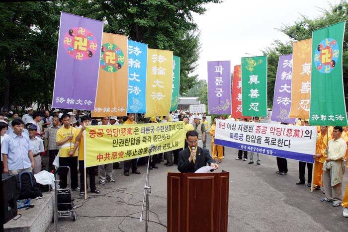 反迫害6周年 法轮功学员韩国首尔市大规模集会游行 呼吁制止中共对法轮功的野蛮镇压 图为法轮功学员发表声明