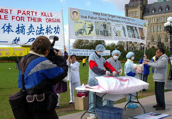 法轮功学员在渥太华国会山前集会吁制止中共迫害图为模拟演示活摘器官吸引民众拍照