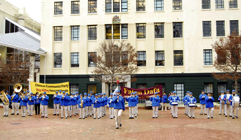 法轮功学员在新西兰惠灵顿市广场集会和平抗议中共八年迫害图为天国乐团演奏“法轮大法好”2007-7-22