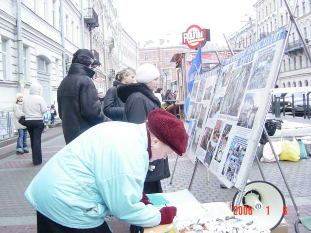 俄罗斯法轮功学员彼得堡街头向民众介绍法轮功以及发生在中国的迫害真相。2006-1-6