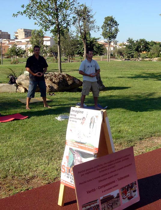 法轮功学员在意大利撒丁岛的公园炼功和摆放真相展板