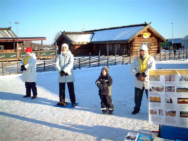瑞典法轮功学员在著名国际滑雪赛地点莫拉市洪法讲真相,让人们了解迫害的严重性及法轮功的真相