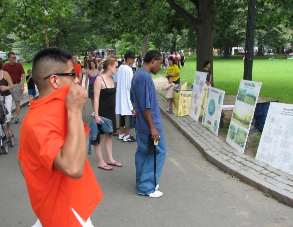 波士顿法轮功学员在公园讲真相展示大法的祥和与美好 图为游客在看真相展板 2006-7-2