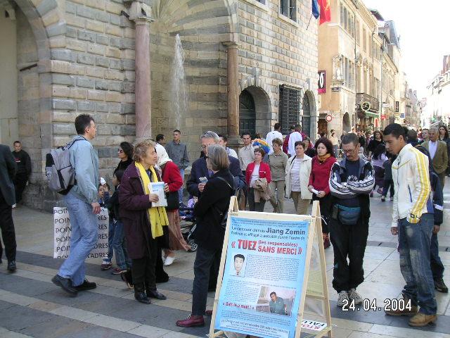 法轮功学员在法国博桑松(Besancon)市政府前, 揭露中共迫害法轮功学员的暴行 2004-04-29 加拿大法轮功学员在渥太华郁金香节举行的花船游行时洪法 2004-05-25