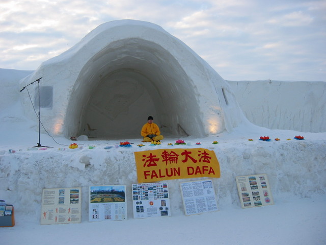 芬兰法轮功学员在凯米市的“雪堡”洪扬法轮功并讲述迫害真相