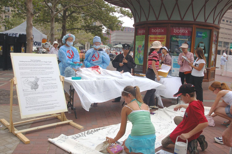 法轮功学员聚集波士顿世界器官移植大会举行反酷刑展 呼吁国际社会关注正在中国发生的活摘器官罪行 图为人们签名支持反迫害2006-7