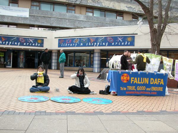 伦敦法轮功学员来到闹市区Wood Green图书馆前讲真相 图为学员在炼功
