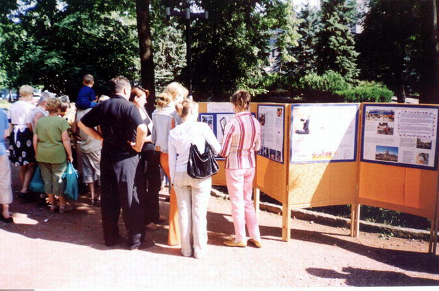 俄罗斯五山城学员向游人洪法讲真相,真相展板前人们详细看迫害真相