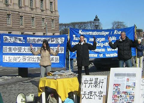 瑞典学员在市中心Mynttorget广场呼吁社会各界关注苏家屯秘密集中营的虐杀 2006-3-25