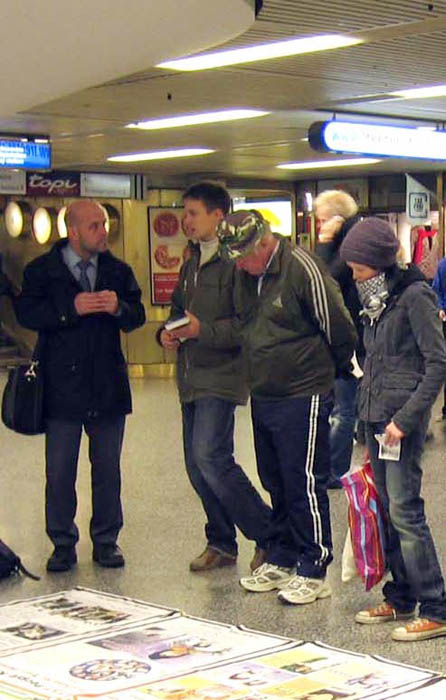 芬兰学员在赫尔辛基洪法,讲真相。民众关注迫害真相 2005-11-26