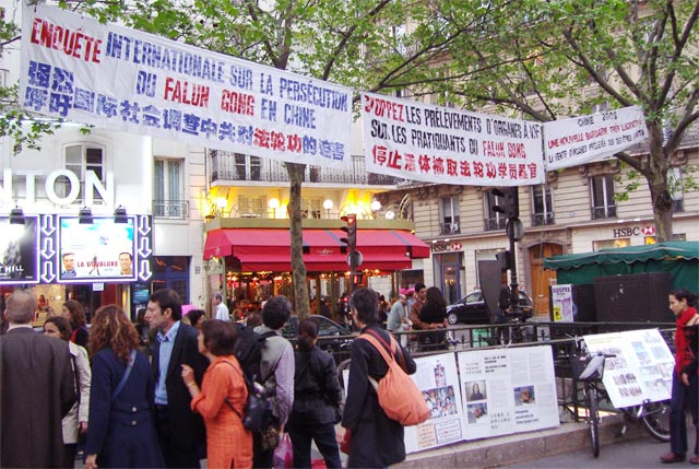 法国学员在巴黎铁塔人权广场揭露中共劳教所、集中营的罪恶。民众强烈谴责中共罪行 2006-5-6至7
