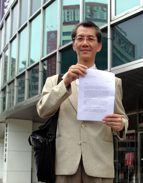 台湾法轮功学员呼吁新加坡当局勿做中共迫害法轮功的帮凶 图为学员向新加坡驻台办事处递交抗议信 2006-7-20