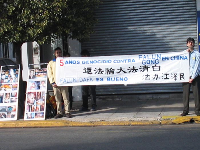 2004年7月20日,阿根廷法轮功学员在中使馆前揭露江氏集团五年来对法轮功的迫害