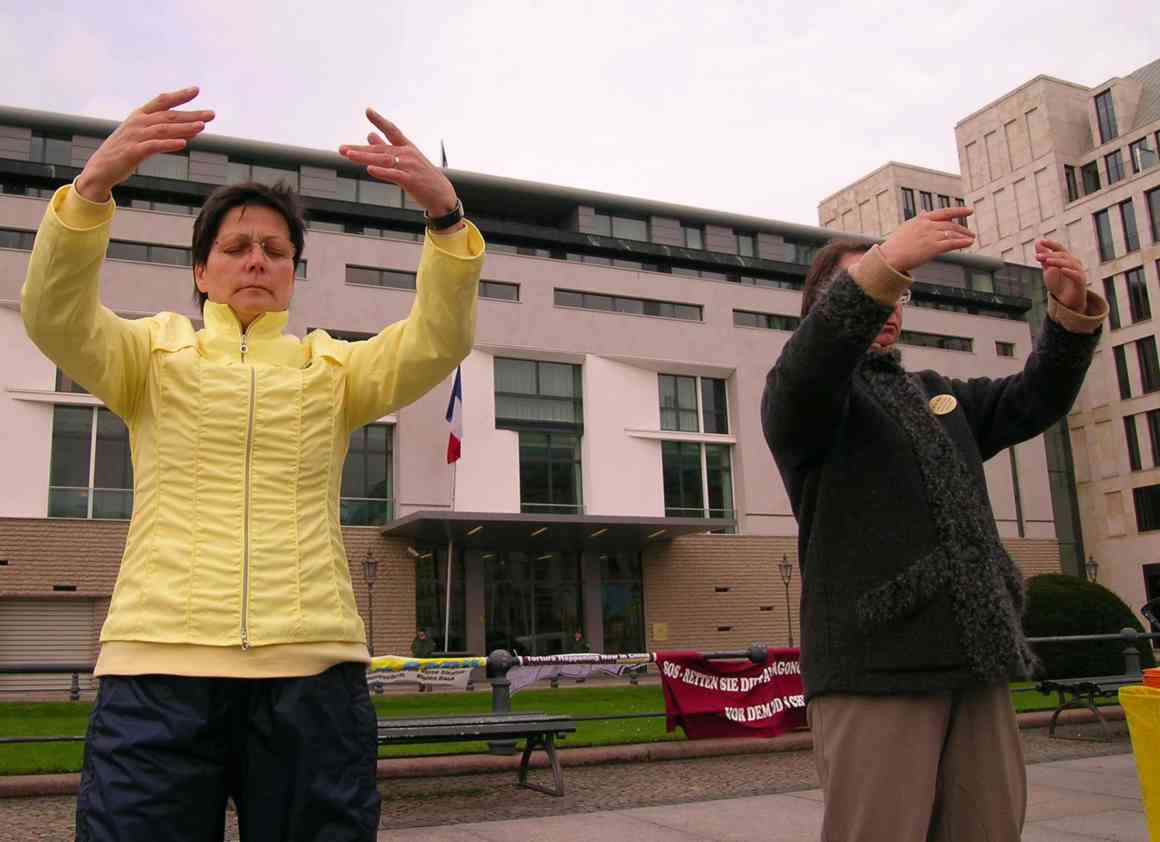 胡锦涛访德前夕 法轮功学员柏林请愿 呼吁停止迫害法轮功 图为功法展示