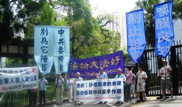法轮功学员在香港集会游行和平抗议港府执行中共黑名单图为在政府总部外宣读公开信2007-6-26