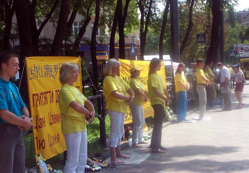 2004年7月20日,乌克兰首都基辅市的法轮功学员们在中使馆前举行了抗议静坐集会