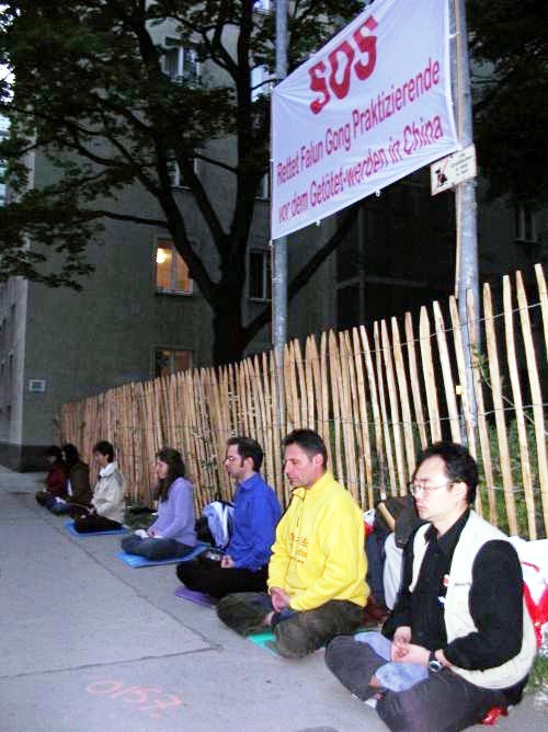 法轮功学员在维也纳中领馆前烛光守夜纪念“四·二五”并和平抗议中共八年来的迫害.