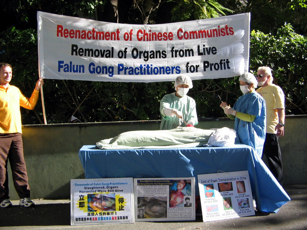 澳洲法轮功学员在高等法院前揭露中共暴行,图为模拟演示中共活摘器官暴行2006-7-2