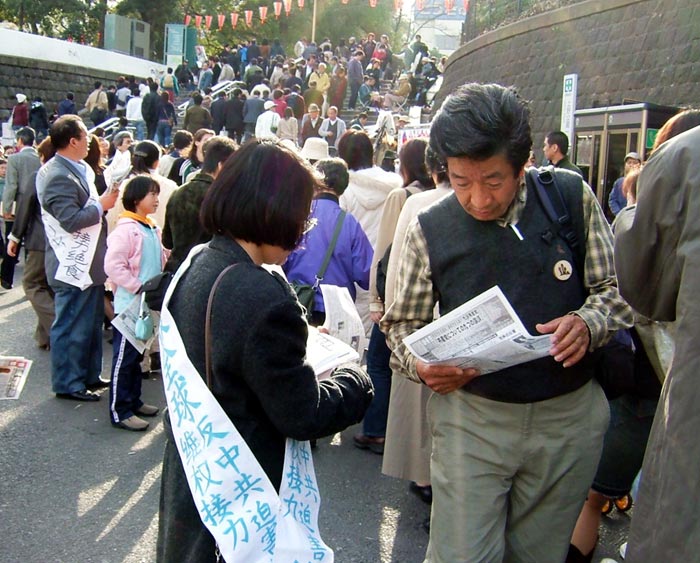 日本学员前往国会和平抗议中共罪行,图为:身披绝食肩带,向游人发真相资料06-4-19