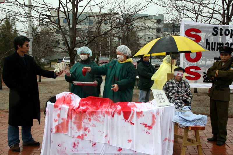 澳中人权对话之际 法轮功学员在澳洲外交部门前举行活动要求停止迫害法轮功 图为模拟中共活摘法轮功学员器官的暴行2006-7-24