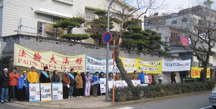 日本法轮功学员聚集到中领馆前,举行揭露中共对民众的迫害