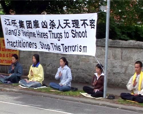 惊闻曾庆红在南非访问涉嫌雇凶枪击欲对其起诉的法轮功学员,爱尔兰法轮功学员于2004年6月29,30日在中使馆前和平抗议