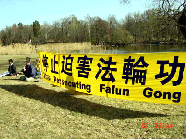 4.25和平上访4周年之际, 法轮功学员在中国驻瑞典斯德哥尔摩领馆前和平请愿 2003-04-25
