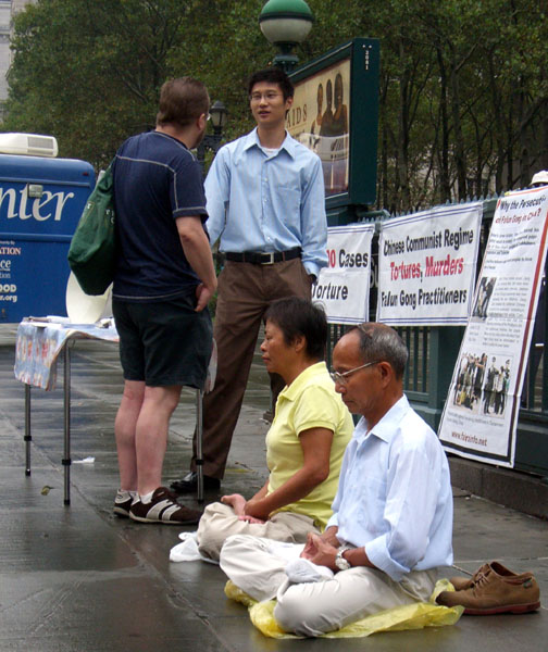 法轮功学员在纽约布碌伦最高法院前揭露中共活摘器官暴行,图为向路人讲真相2006-8-28