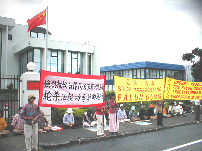 新西兰奥克兰法轮功学员在中国领事馆前抗议江XX对法轮功学员的“杀无赦”的密令 呼吁国际社会帮助制止暴行 新西兰 2002-3