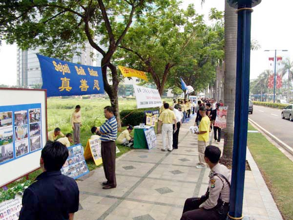 2004年12月10日国际人权日之前,印尼雅加达法轮功学员在中使馆对街,举办图片展和模拟反酷刑展,揭露中共江氏集团对法轮功的迫害