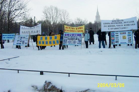 法轮功学员在俄罗斯中国大使馆前,呼吁中国立即停止迫害法轮功 2004-03-06