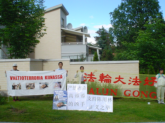 芬兰法轮功学员中使馆前和平请愿,抗议中共虐杀法轮功学员高蓉蓉,要求严惩凶手