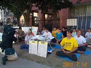 多伦多法轮功学员泽农、康妮在中领馆前和平请愿200小时 呼吁紧急行动起来制止在中国对法轮功学员的虐杀 加拿大 2001-7