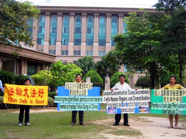 马来西亚学员向政府呈交调查团报告和调查征签,图为学员们向马来西亚政府呼吁2006-7-11